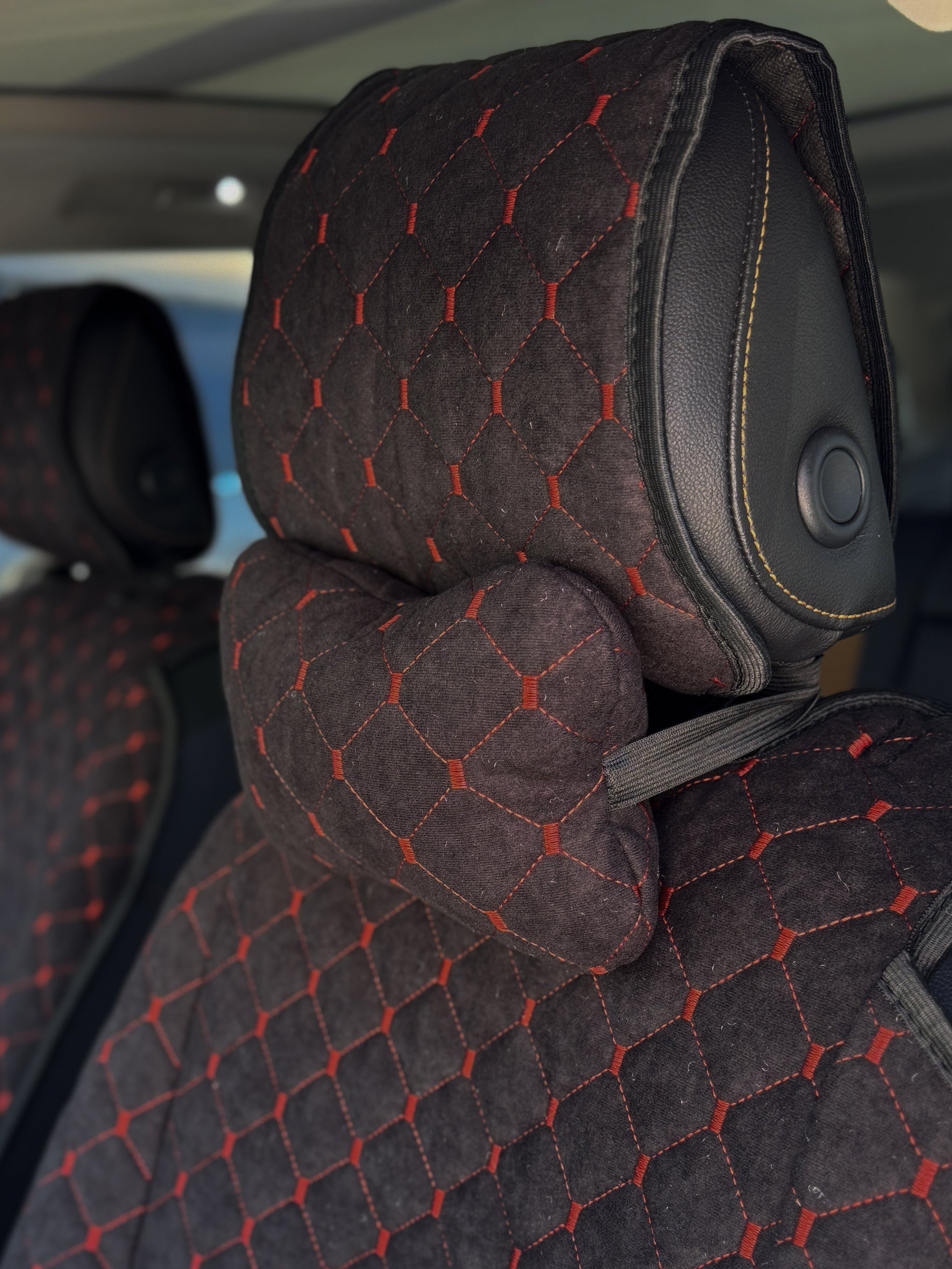 Подушка під шию з алькантари стандарт “Чорний ромб із червоною ниткою“