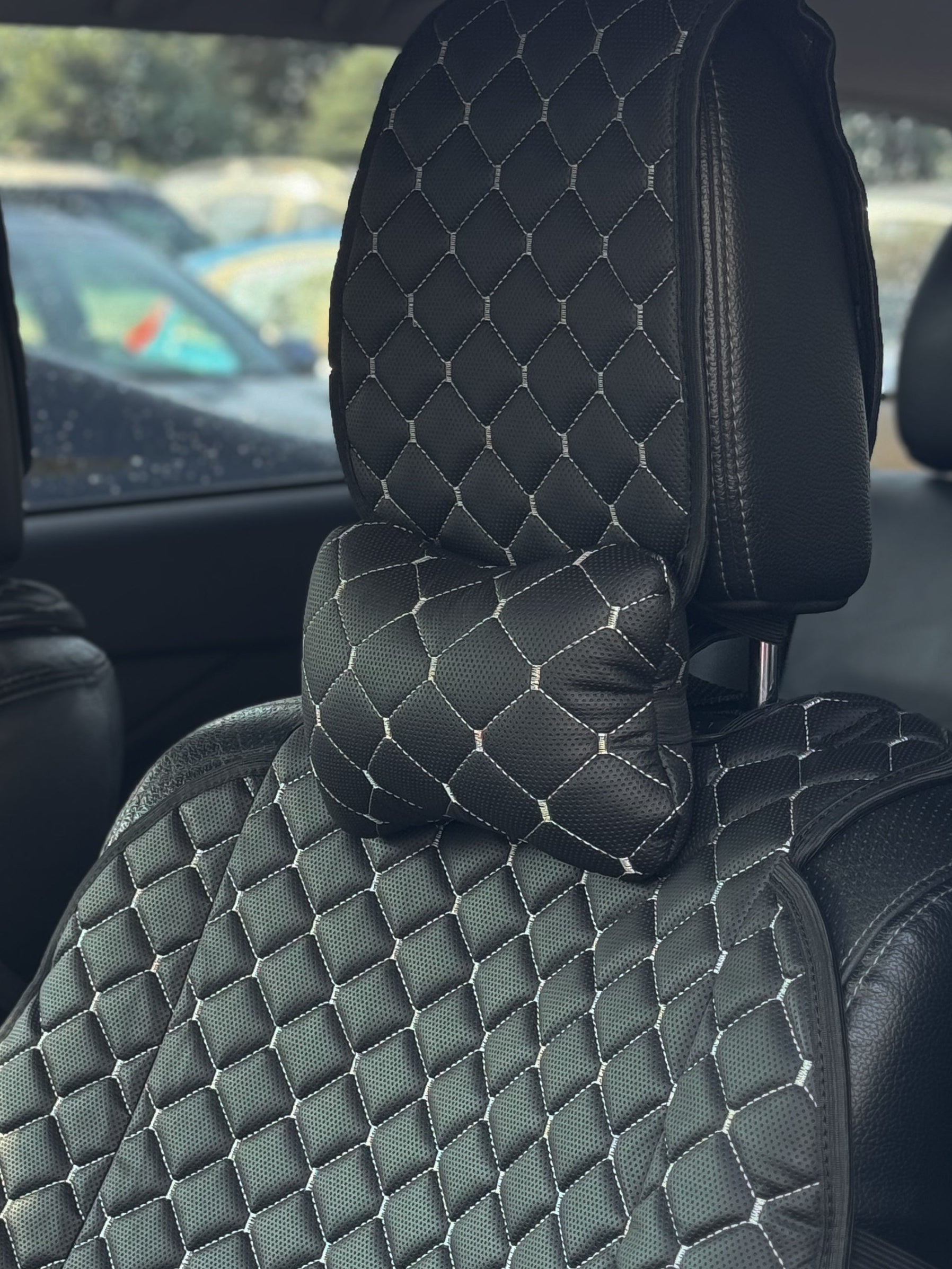 Подушка під шию з перфорованої екошкіри “Чорний ромб із сірою ниткою“